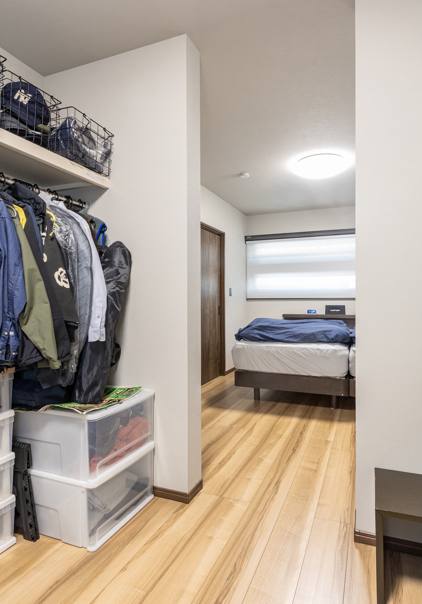 廊下やホールにつながるウォークスルークローゼットは家族全員が使える収納にもなります。各部屋に分散していた衣類や荷物をまとめることで、家全体の収納効率もアップします。