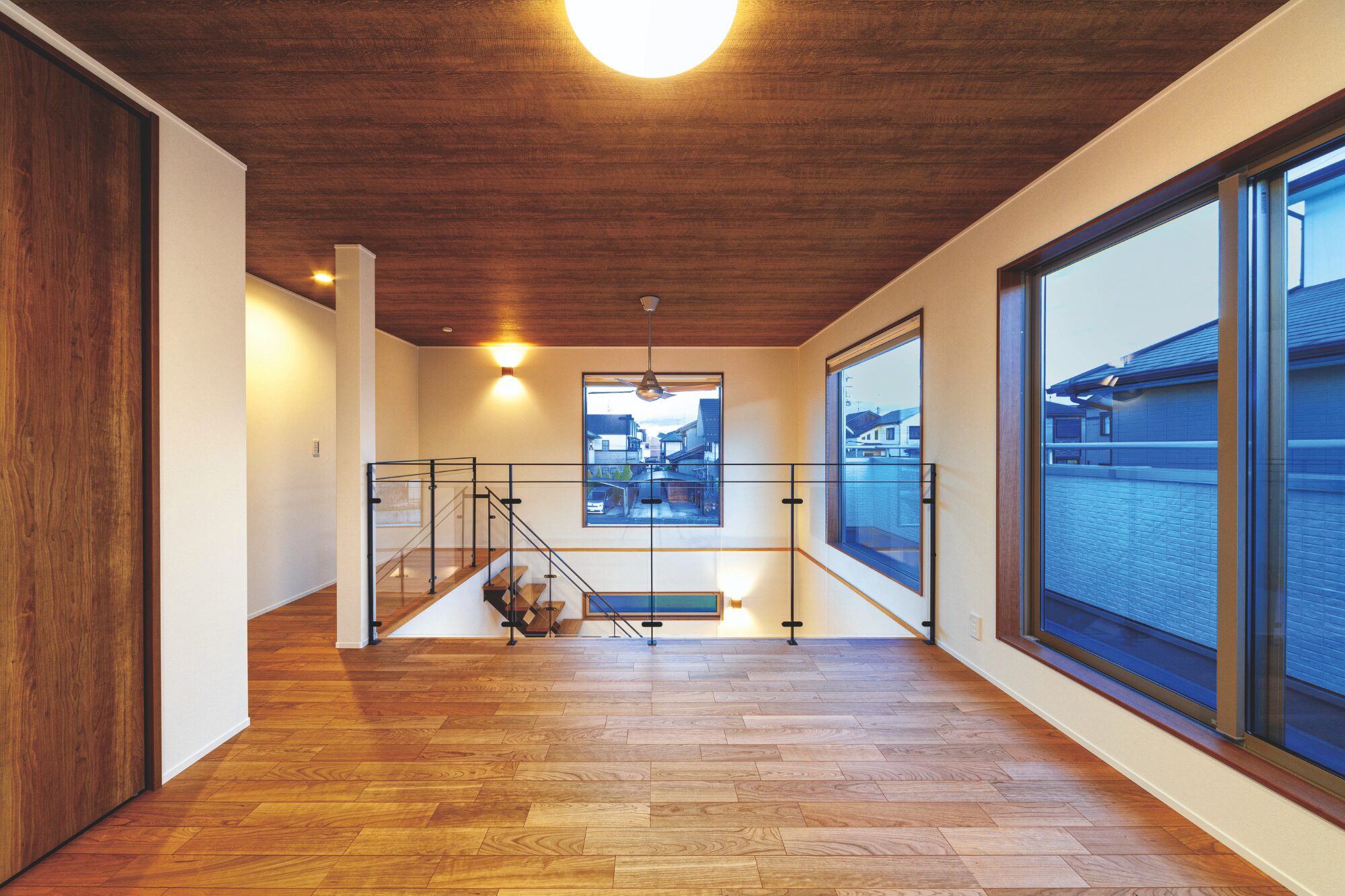 あるお客様は、五条川の桜を眺める家を実現されました。2階の階段ホールに丸窓を設け、春はここから満開の桜並木を楽しめます。窓をホールに設けたのもポイント。共有スペースのため、家族全員が景色を楽しむことができます。