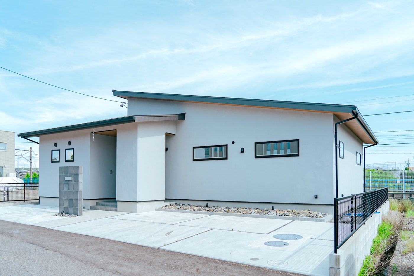 片流れはスタイリッシュな雰囲気を演出できますが、平屋で採用する場合、瓦にすると勾配が急になり過ぎて違和感のあるケースも。屋根材にガルバリウムを用いると、勾配を緩くすることができるため、片流れの魅力を存分に発揮できます。