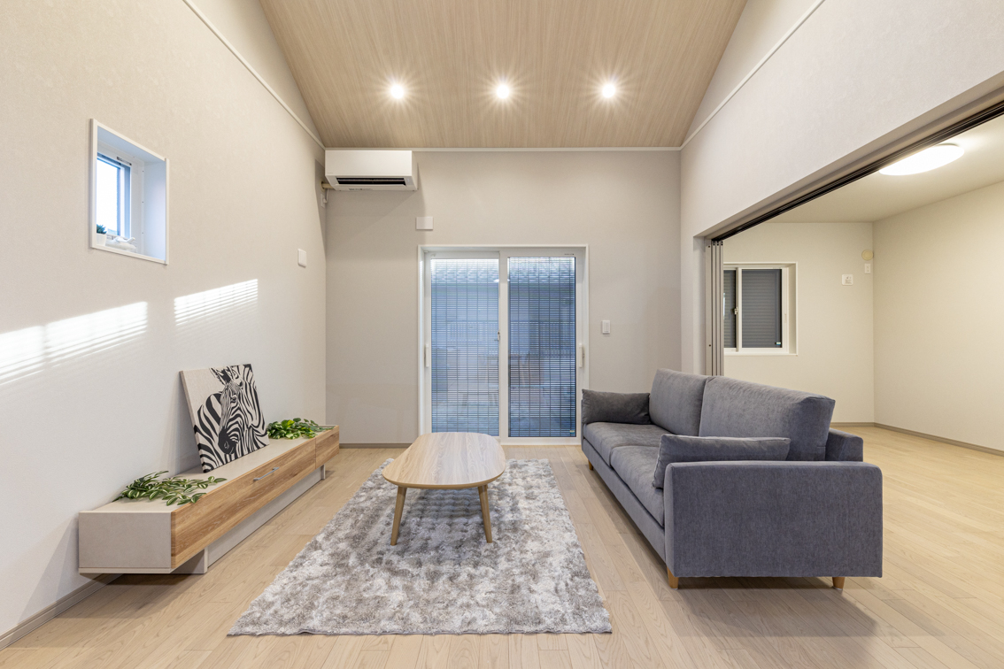 15帖のLDKは、斜め天井を採用することで、それ以上の広がりを感じられる空間。室内に入った瞬間、「想像よりもずっと広い」「開放感がある」と驚かれる方も少なくありません。平屋ならではの斜め天井が伸びやかな空間を演出する上、隣接する洋室との仕切りを開け放って21帖の大空間とすることも可能です。