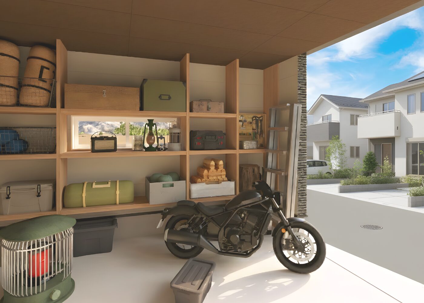 自転車やバイク、キャンプ用品など、増え続ける趣味の道具を広げて・整えて・楽しめる インナーガレージ。