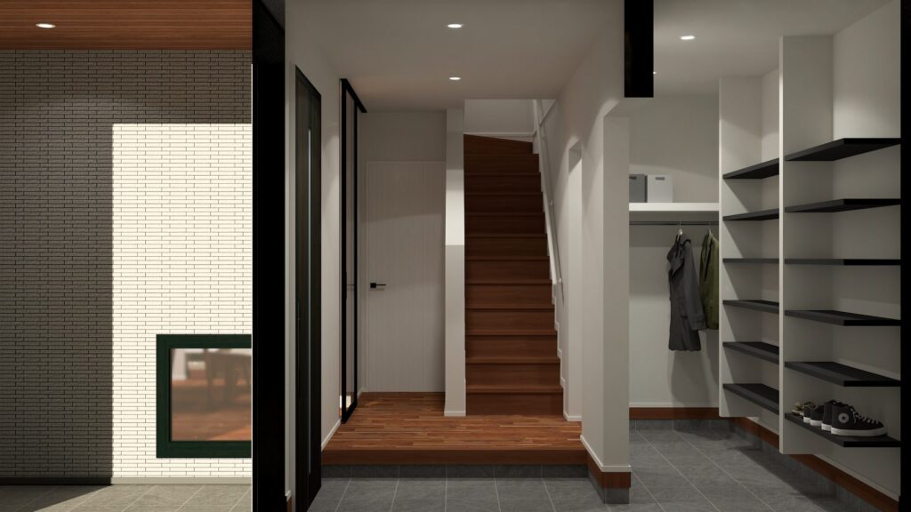 “玄関〜土間収納〜パントリー〜キッチン”と直結するウォークスルー動線を採用しました。