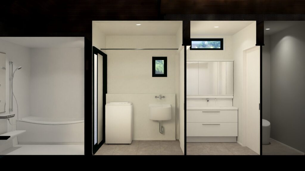 重い荷物もスムーズに運び込めるほか、男の子2人の育児を考慮し、脱衣室には汚れ物をサッと洗えるスロップシンクも完備しています 。