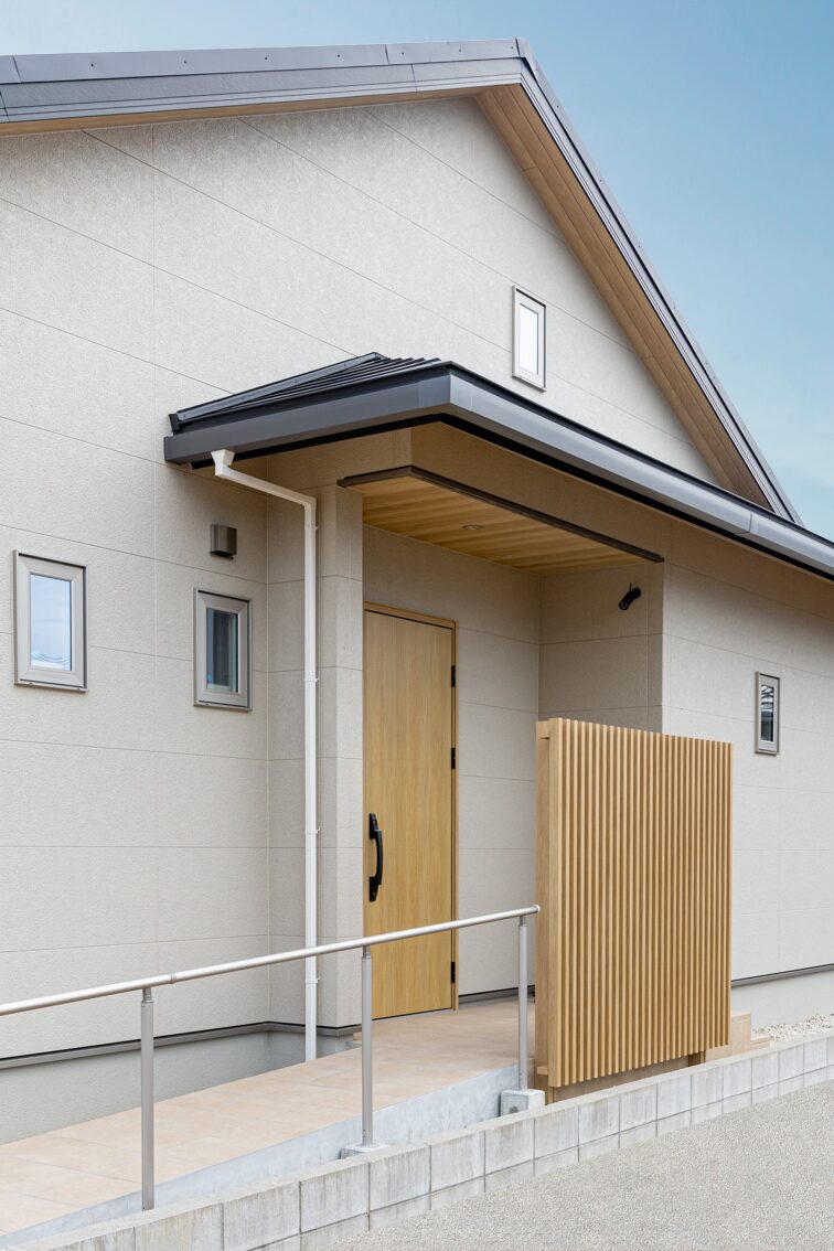 外観には、明るいグレージュ系の外壁と木目調の軒天・玄関扉を採用。