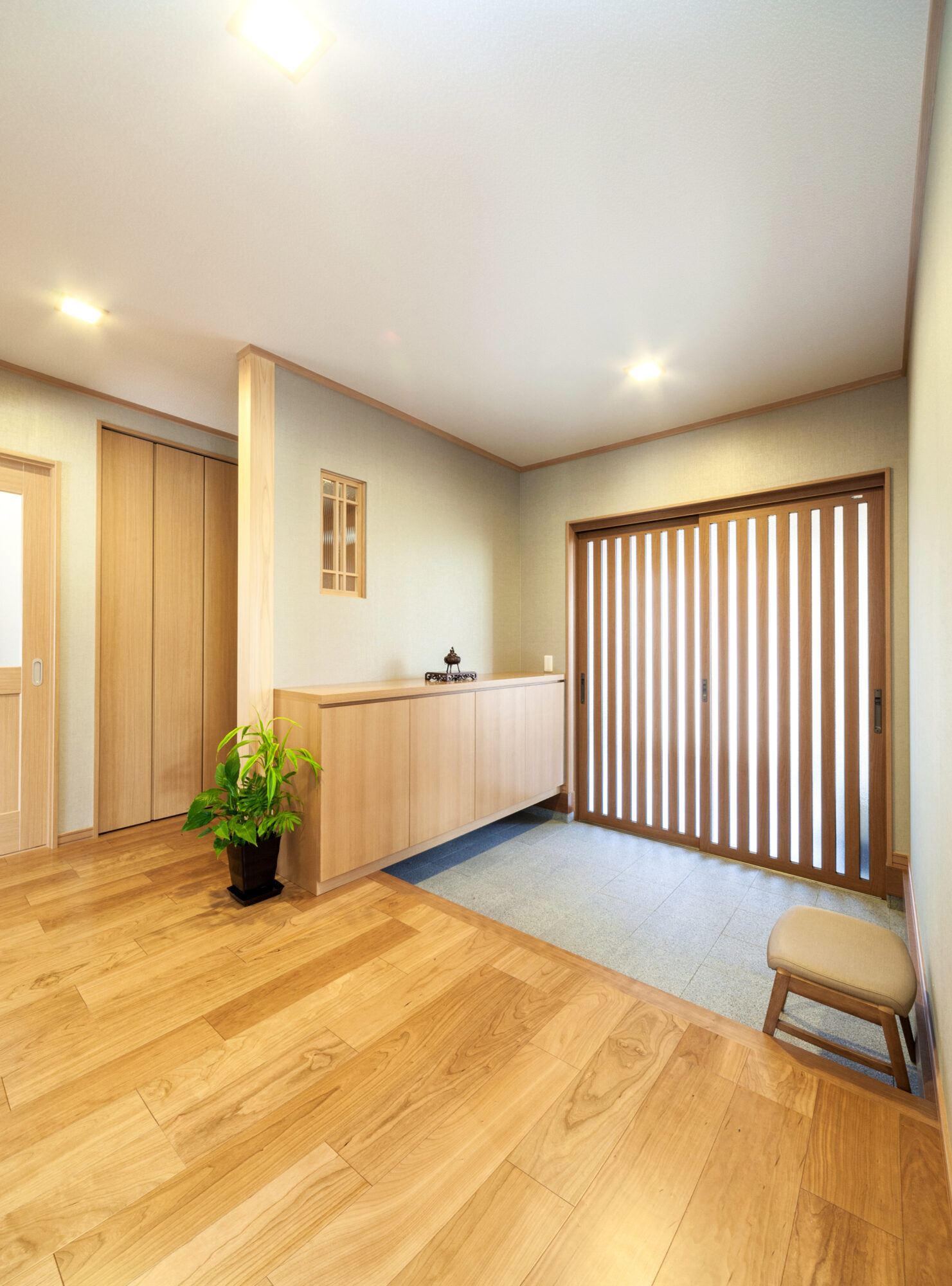 和モダンの落ち着いていて、飽きのこないデザインが好きなんです。玄関は外でも中でもない雰囲気の空間にしてもらいました。