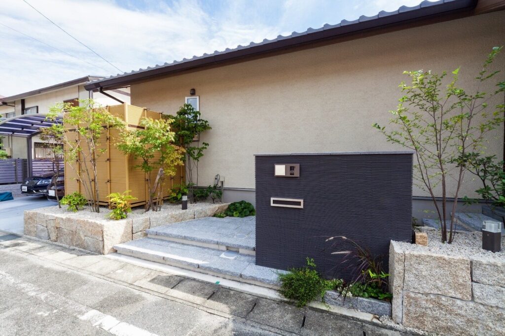最初こそ、植栽は大変だからいらないと思ってたんだけど、今はちょうどいい具合になったね。お風呂の横の坪庭は落ち着いた良い雰囲気になった。外構は石もこだわったよ。岐阜の山奥から運んできた御影石で、下地の積み方まで工夫してもらって満足の仕上がり。和モダンの家にこだわってたから、外構もタイルは使いたくなかったんだよね。