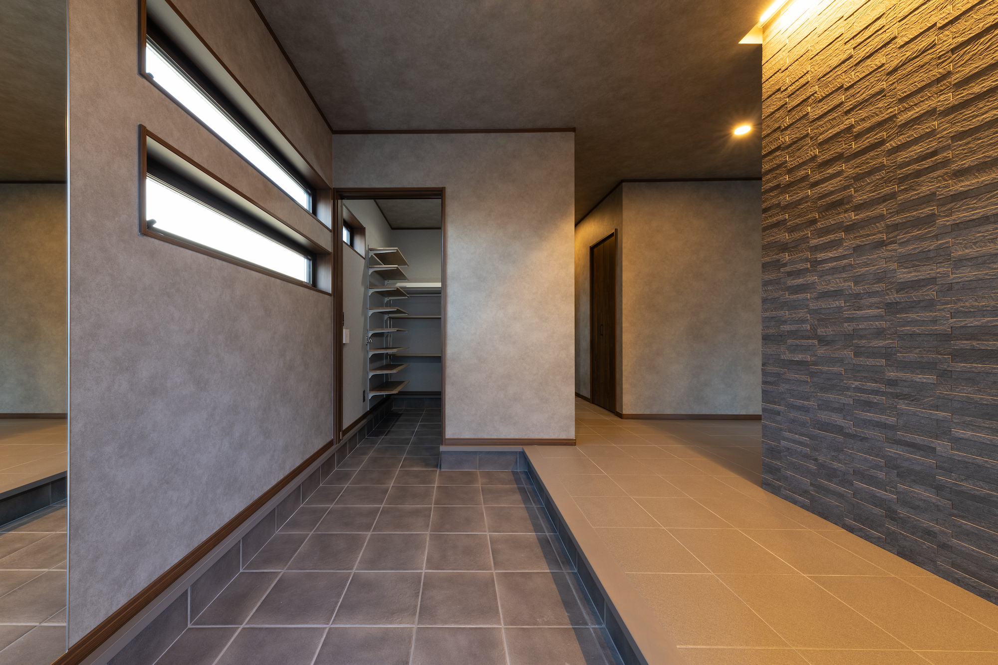 愛犬たちが安全かつ快適に暮らせるよう、住まいはさまざまな工夫が施されています。特にこだわったのは床材。以前の住まいでは滑らないように絨毯を敷いていましたが、毛が絡まったり、ニオイが染みついたりとお手入れに苦労していたそう。新居では、サンゲツの「ノンスキッド」というシート材を採用。滑りにくくて傷つきにくい素材で安心な上、汚れも取れやすいため掃除の手間も減りました。玄関ホールと廊下にはタイルを使用して耐久性を高めています。